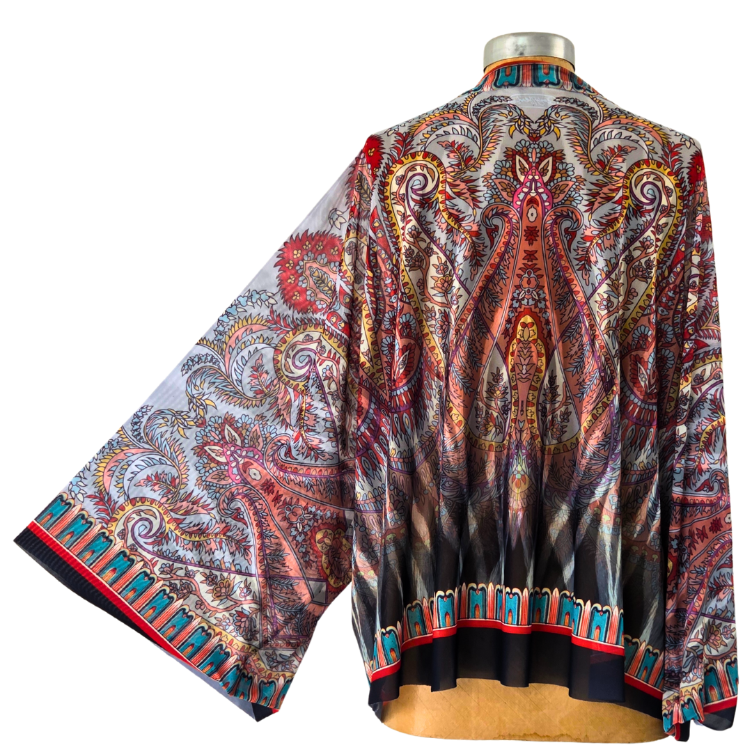 A soft and sheer, free flowing kimono style top with wide kimono sleeves, a round neck with tie detail and closed center front. This relaxed fitting top ends just below the waist, there is a CF slit before the hem to allow this top to be tied in front if so desired. The neck ties can also get thrown over the shoulder for a skinny scarf style effect, let to lie loosely or just tied at CF. The bespoke print of PAISLEY with ZEBRA is a most unusual print of Purple bold zebra print with classic paisley on a subtle background of light grey. The print wraps perfectly around the kimono with a bold striped, border design. Wear with white or black linen trousers or over a shift dress for beautiful summery outings.