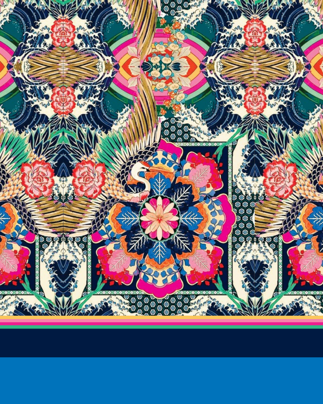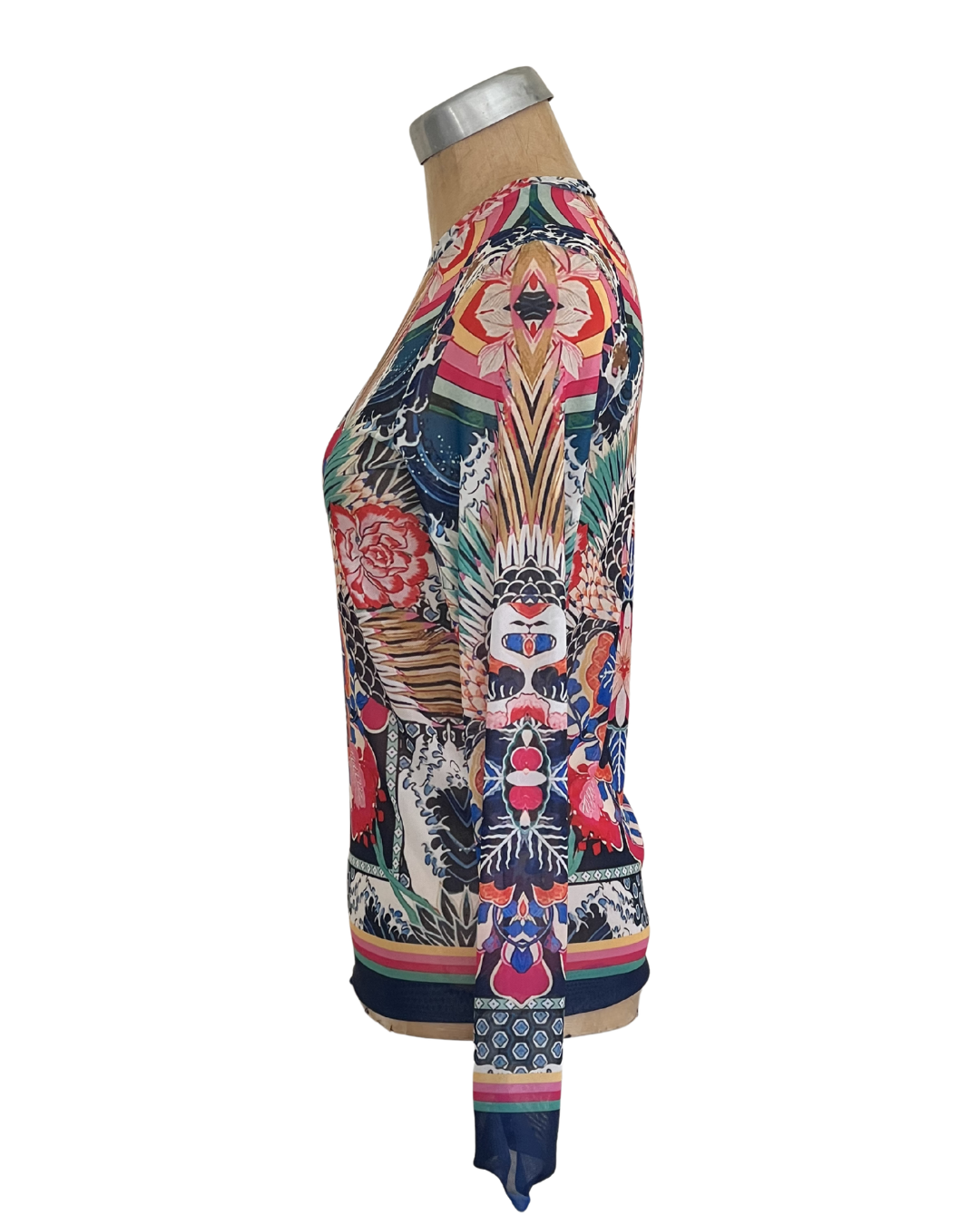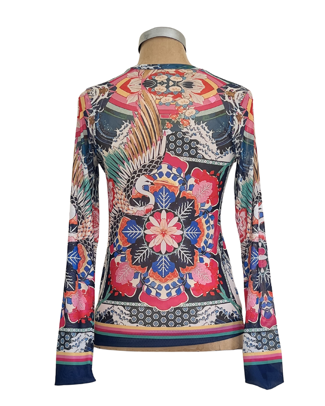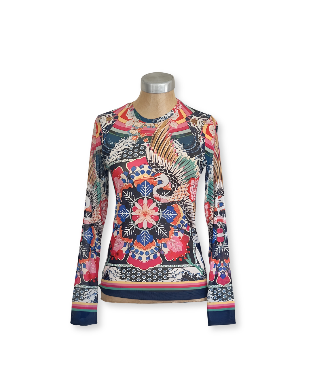Soft, sheer and stretchy. This long sleeve fitted top with high round neckline is the most versatile item you will add to your wardrobe this season. The bespoke CRANE WITH WAVES is a vibrant print of cranes and stylised waves in shades of deep blue, coral red, soft pink and teal. The print wraps perfectly around the body and the tight fitting sleeves too. Wear with jeans, faux leather joggers or velour lounge pants. Perfect for layering with a cami or skinny polo underneath.