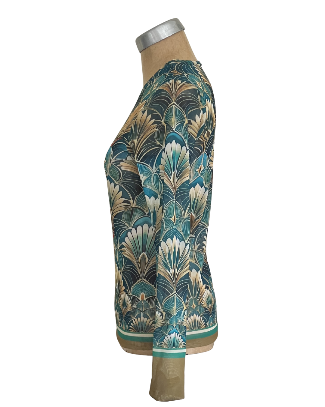 Soft, sheer and stretchy. This fitted long sleeve top with a high neckline is an easy go-to for any wardrobe. The bespoke DRAGON TAPESTRY print features a stylised dragon with decorative, tapestry-inspired details in warm tones of teal, gold and soft neutrals. The print flows naturally over the body and sleeves. Wear it with jeans, faux leather joggers or velour lounge pants. Perfect for layering with a cami or a thin polo underneath.