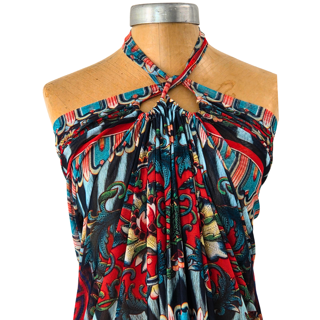 This sarong style skirt in soft, sheer and free flowing mesh wraps to your desire. A gathered section at the front of the skirt creates a fabulous draping effect once the ties are wrapped around the waist. There is a center front slit. The flattering and vibrant bespoke print ZEBRA ROSE adorn this versatile skirt. Wear with matching closed kimono top or sleeveless mesh tank top or even the asymmetrical matching mesh top. One cab also wear this skirt as a cover up to the beach or change up the style completely and tie around the neck as a halter style dress or cover up.