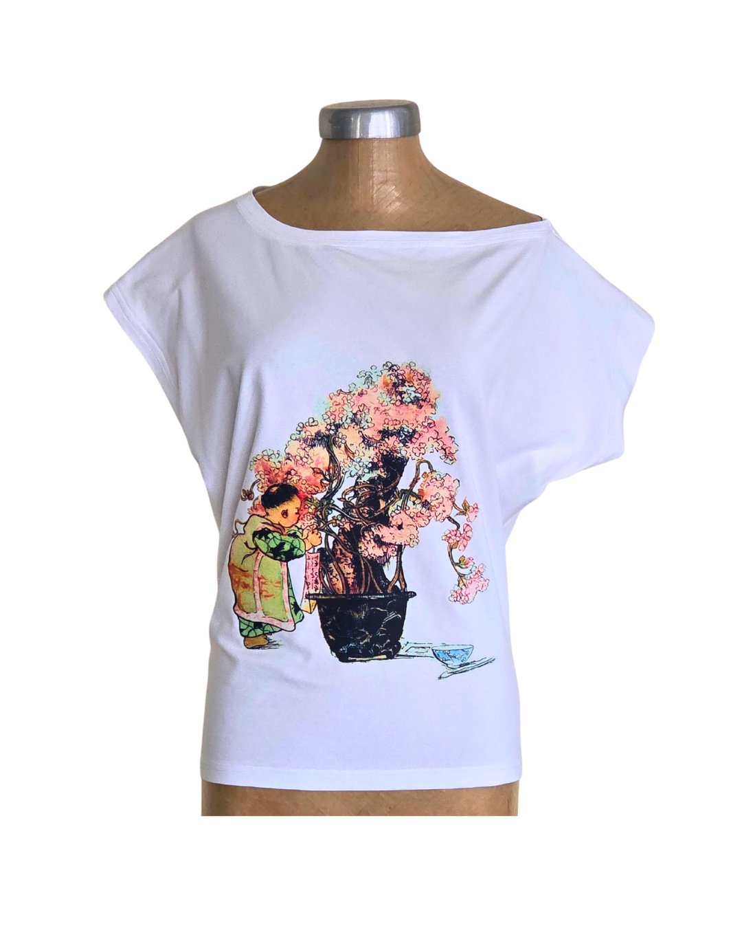 A simple, classic 100% Cotton white T Shirt with a twist. A super comfortable, 'schloemphie' style which is a relaxed cut with stretch and an asymmetrical neckline. This cut falls naturally to one side giving an off the shoulder look with a bit of a sleeve. A direct to film, vintage Japanese print of a child tending to a bonsai, adorns this T to make it extra unique. A real weekend item, pair with your favourite jeans or jorts for extra enjoyment.