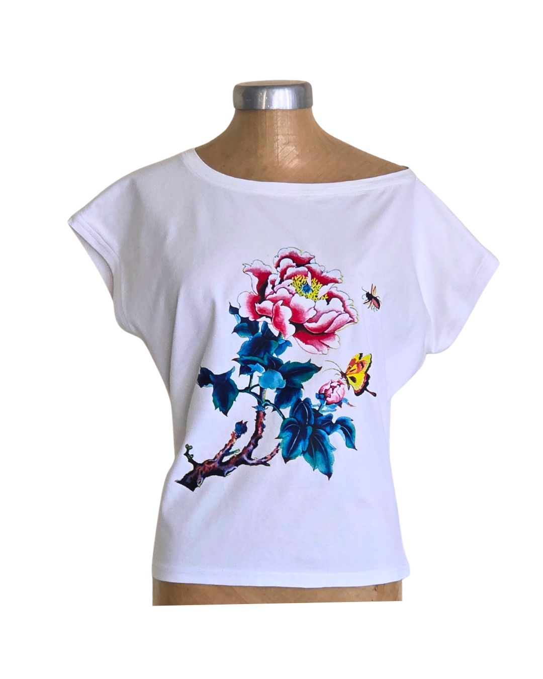 A simple, classic 100% Cotton white T Shirt with a twist. A super comfortable, 'schloemphie' style which is a relaxed cut with stretch and an asymmetrical neckline. This cut falls naturally to one side giving an off the shoulder look with a bit of a sleeve. A direct to film print of a butterfly and Bee along with a vivid Peony adorns this T to make it extra unique. A real weekend item, pair with your favourite jeans or jorts for extra enjoyment.